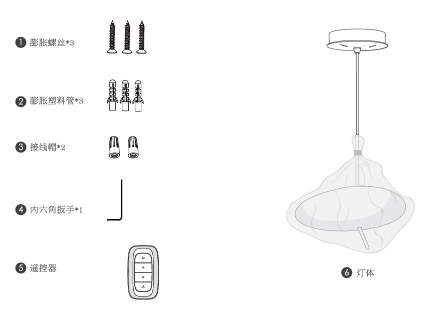 膨胀螺丝*3;膨胀塑料管*3;接线帽*2;内六角扳手*1;遥控器*1;灯体*1;